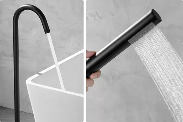 Embrace the fusion of luxury and practicality with our freestanding bathtub faucet. Its dual handle design ensures precise control over water temperature, while the inclusion of a handheld shower offers flexibility, whether rinsing off after a bath or cleaning the tub. The contemporary design, paired with the matte black finish, suits any modern bathroom, making it a versatile addition to your home.